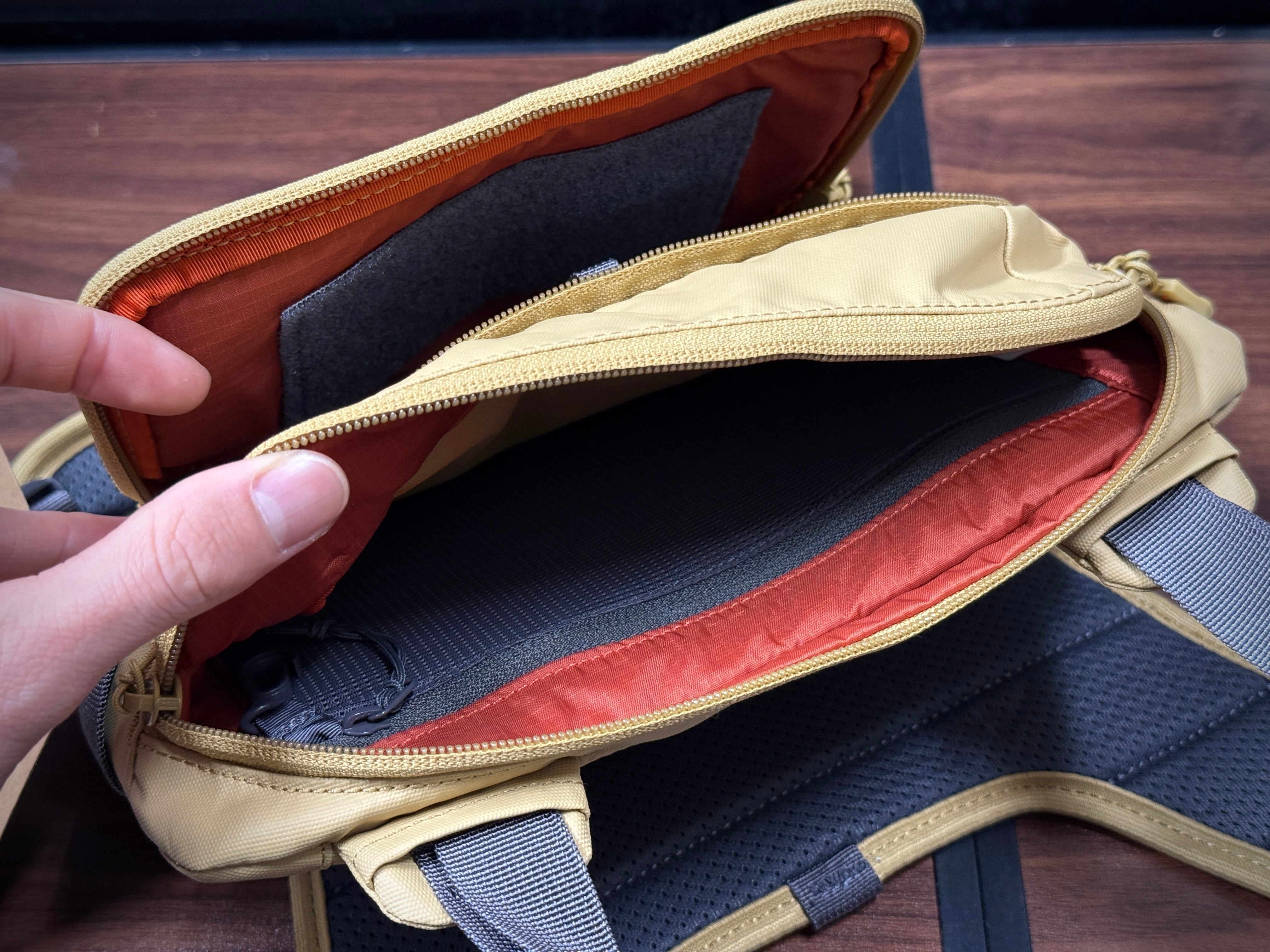 ・前面にYKK®ジッパーのドロップトレーストレージとその内外両方にVelcro®のフライパッチ、加えて内側に2枚のメッシュポケット